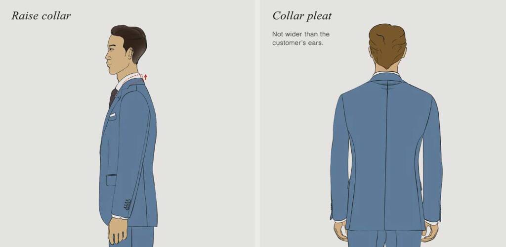 The jacket collar is resting too low at the back of the customer’s neck.
